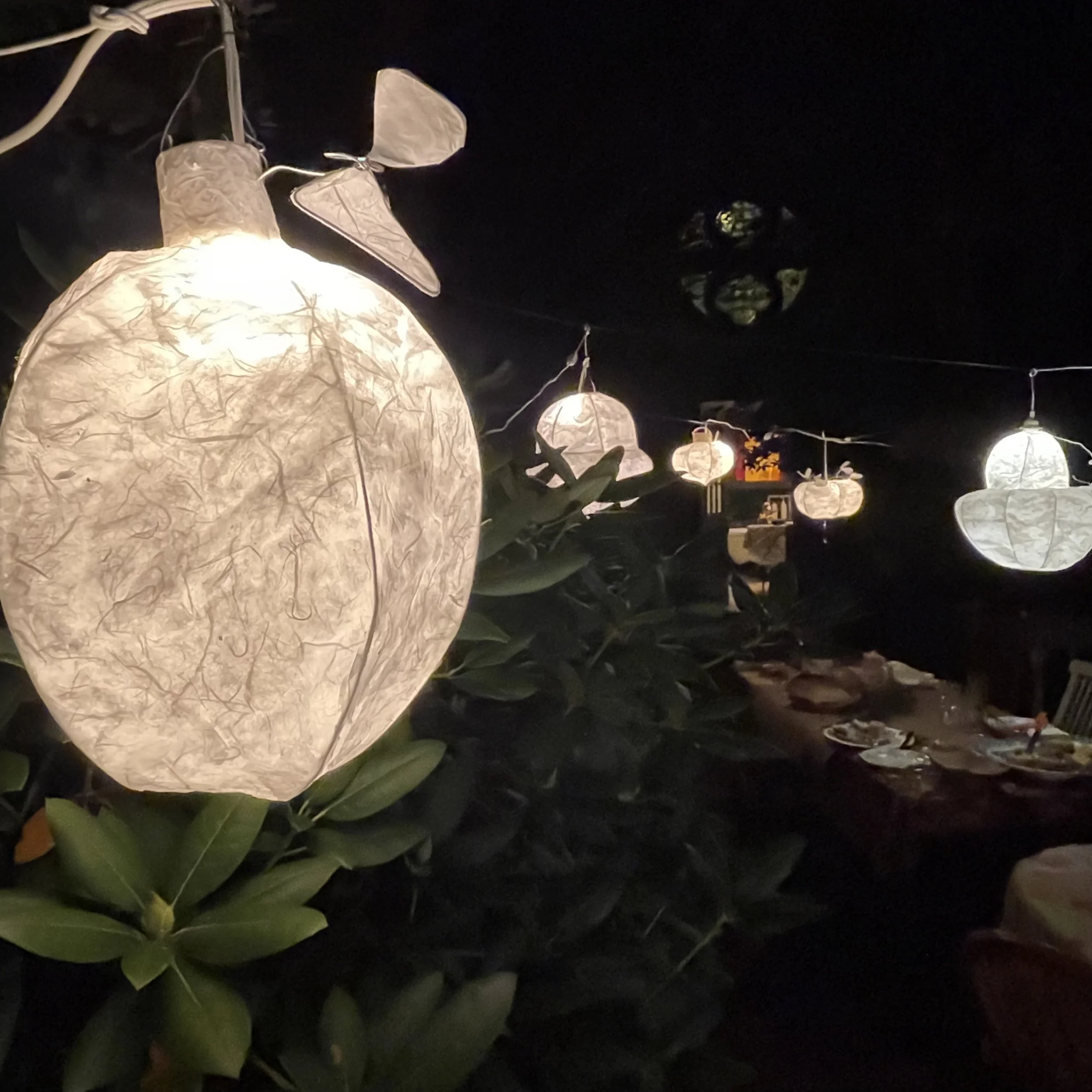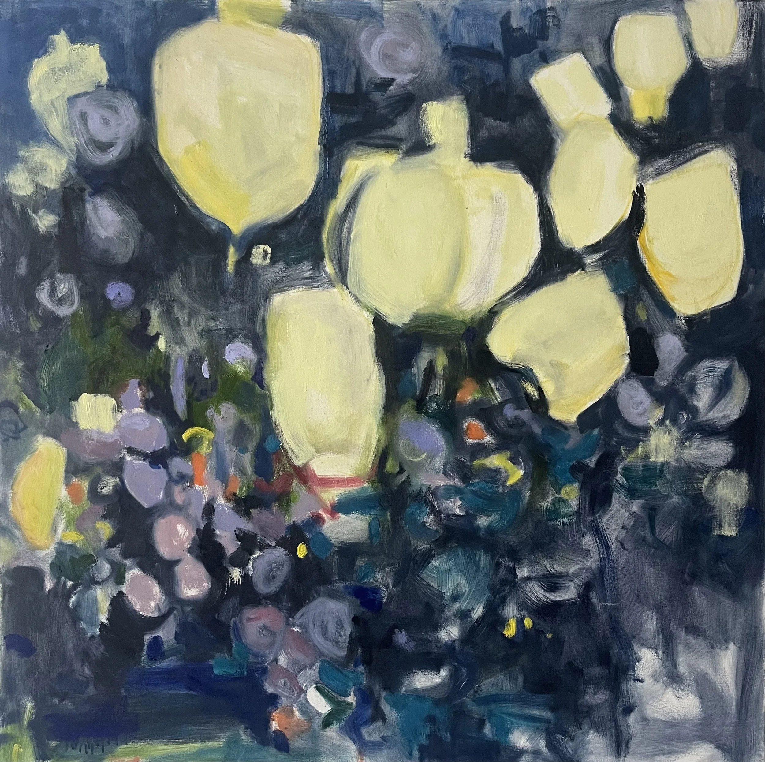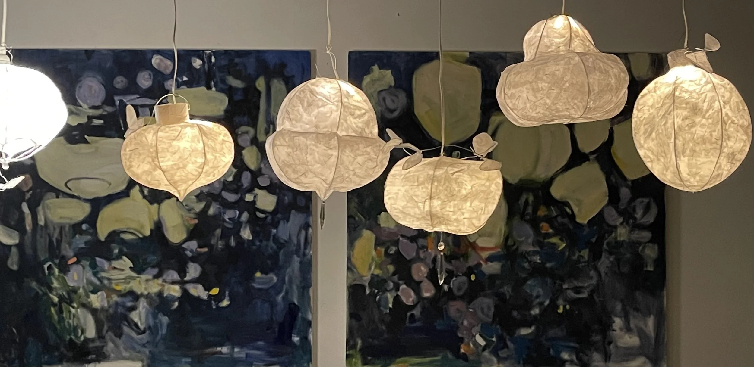 Here, as we look in and up simultaneously, the divisions between realities dissolve. The moth ascends to the light and then becomes the light. 2d paintings expand into 3d luminaries, which inspire more paintings in which we celebrate our infinite possibilities and commingle with sprites and elementals.