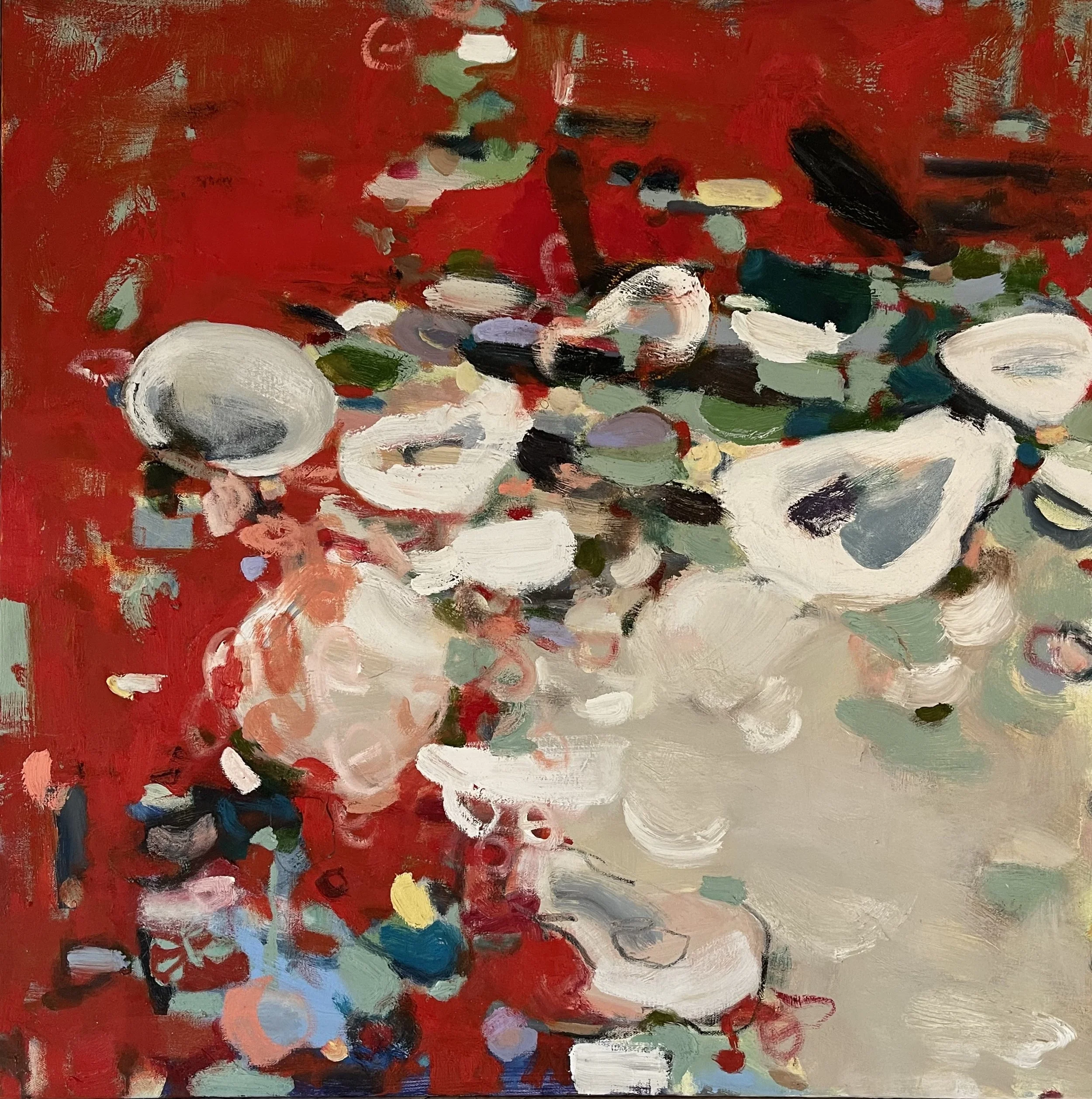 Shells, the bones of the sea, are still my muse though I am increasingly captivated by water, and the play of light across its surface. The shimmer and sparkle stirs me beyond representation, and I am plunging into the abstract. I am seeking that which lives inside the dunes and under the sea, where reflections have substance and substance is sheer.